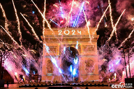 當(dāng)?shù)貢r(shí)間2024年1月1日,法國(guó)巴黎舉行新年慶祝活動(dòng),凱旋門(mén)前燃放煙花。