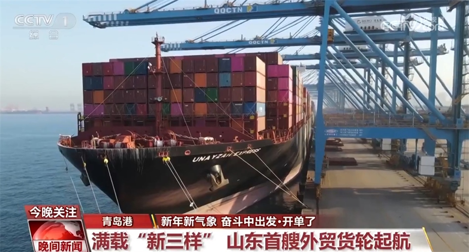 新年伊始,山東首艘外貿(mào)貨輪從青島港起航。3500多個(gè)標(biāo)箱里滿載包括電動(dòng)載人汽車、鋰離子蓄電池、太陽(yáng)能電池等外貿(mào)“新三樣”,總貨值約2億人民幣。