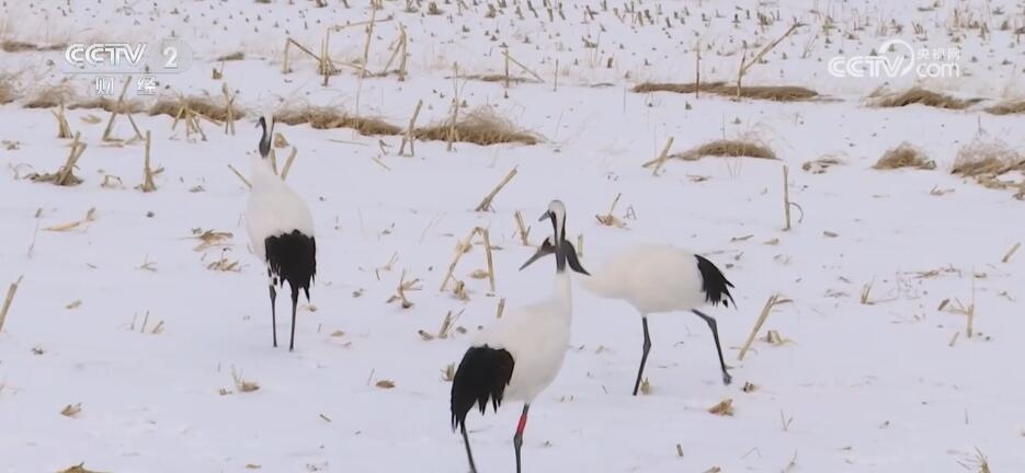 最近幾天,在內(nèi)蒙古烏蘭察布市,村民們發(fā)現(xiàn)有3只丹頂鶴正在這里逗留越冬,這在以往很少見。
