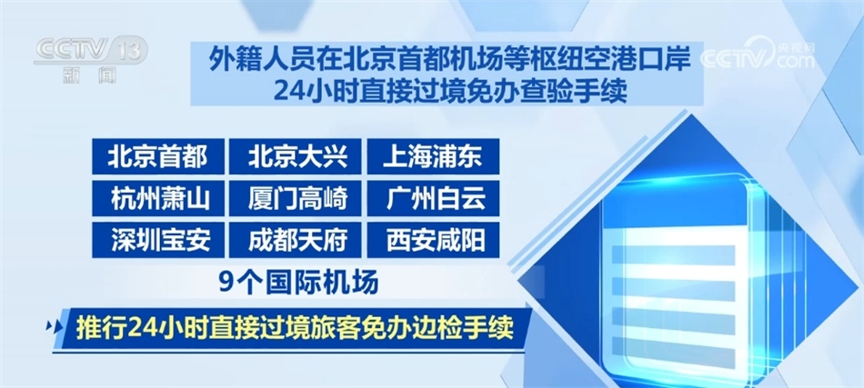 外籍人員在北京首都機(jī)場等樞紐空港口岸24小時(shí)直接過境免辦查驗(yàn)手續(xù)。在北京首都、北京大興、上海浦東、杭州蕭山、廈門高崎、廣州白云、深圳寶安、成都天府、西安咸陽9個(gè)國際機(jī)場,推行24小時(shí)直接過境旅客免辦邊檢手續(xù)。對于持24小時(shí)內(nèi)國際聯(lián)程機(jī)票,經(jīng)上述任一機(jī)場過境前往第三國或地區(qū)的出入境旅客,可以免辦邊檢手續(xù),直接免簽過境。