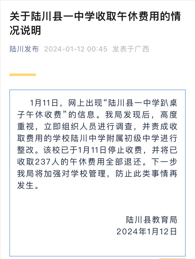 ·廣西陸川一中學(xué)收取“趴桌費(fèi)”?當(dāng)?shù)亟逃郑贺?zé)成學(xué)校整改,已退還全部費(fèi)用。