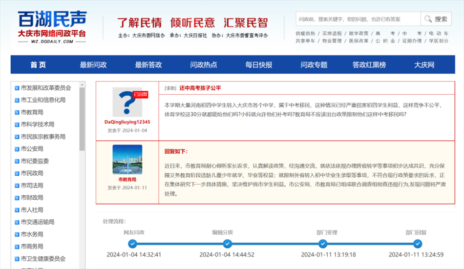 ·家長(zhǎng)稱大量河南中學(xué)生“中考移民”至黑龍江大慶各個(gè)中學(xué),官方回應(yīng):暫時(shí)關(guān)閉學(xué)籍系統(tǒng),成立聯(lián)合調(diào)查組徹查違規(guī)行為。