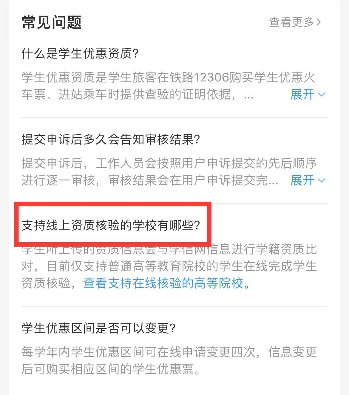 打開(kāi)鐵路12306App,右下角進(jìn)入“我的”頁(yè)面,在學(xué)生資質(zhì)填寫(xiě)頁(yè)面的“常見(jiàn)問(wèn)題”中,找到“支持線上資質(zhì)核驗(yàn)的學(xué)校有哪些?”即可查看支持在線核驗(yàn)的學(xué)校名單。