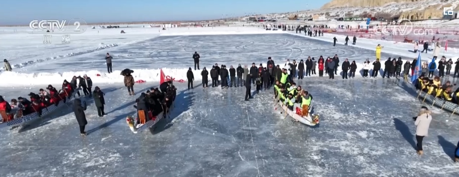 1月21日,在新疆福??h,一場冰上龍舟賽在烏倫古湖湖面展開,吸引了不少游客觀看。