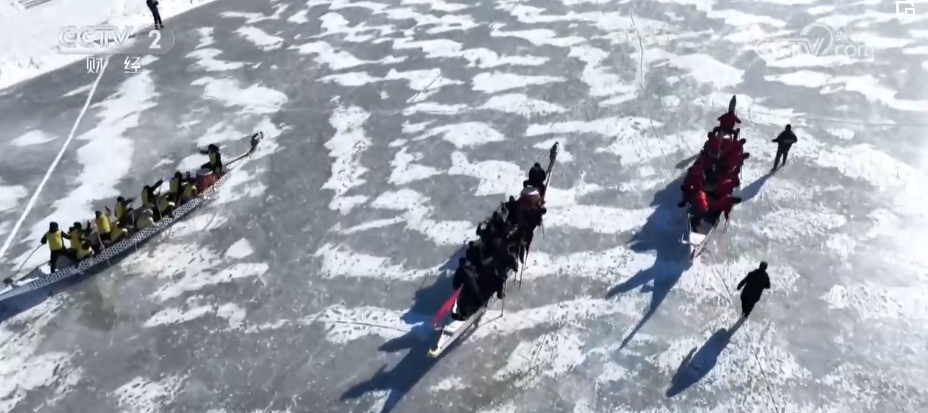當天下午2時,在烏倫古湖已經(jīng)封凍的湖面上,隨著裁判的一聲令下,冰上龍舟比賽開始了,選手們揮舞著冰杖在冰面上激烈角逐。