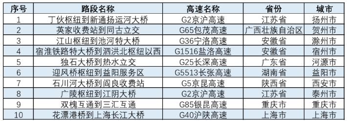 春節(jié)期間,全國高速公路預計易發(fā)生擁堵緩行的路段,如下表所示。