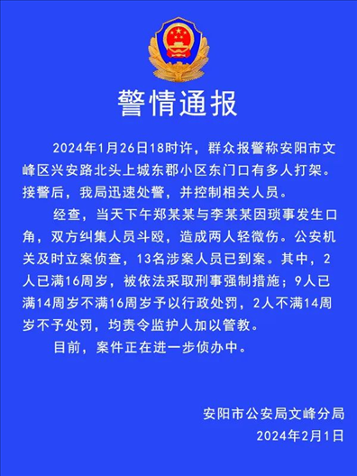 ·河南安陽警方通報一起斗毆案:2人因瑣事爭執(zhí)糾集多人斗毆,13人已到案,其中11人不滿16歲。