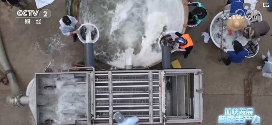 依靠首創(chuàng)的“船載艙養(yǎng)”模式,國(guó)信1號(hào)養(yǎng)殖工船,每年能實(shí)現(xiàn)3700噸高品質(zhì)魚類和650噸優(yōu)質(zhì)蛋白的供給。到了收獲的時(shí)候,艙內(nèi)的大黃魚將通過吸魚泵和傳送帶直接轉(zhuǎn)運(yùn)至休眠池,在那里進(jìn)行快速降溫休眠鎖鮮。