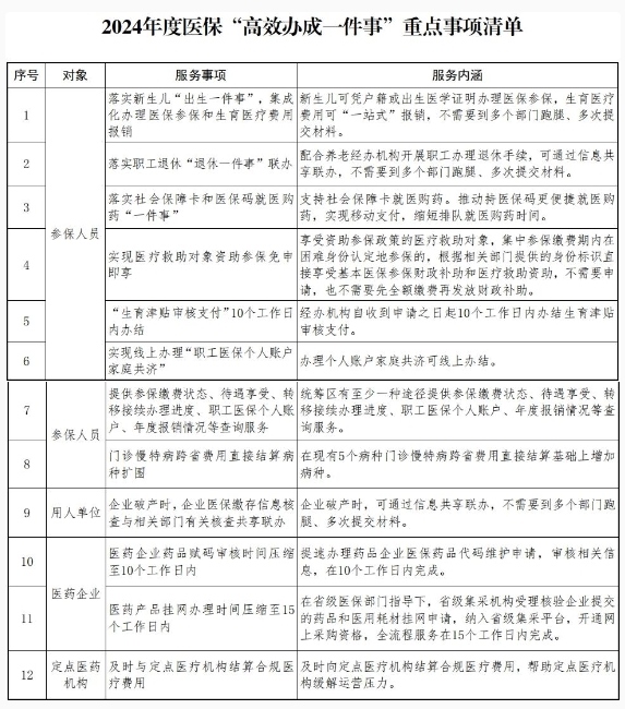 為貫徹落實(shí)《國務(wù)院關(guān)于進(jìn)一步優(yōu)化政務(wù)服務(wù)提升行政效能推動“高效辦成一件事”的指導(dǎo)意見》(國發(fā)〔2024〕3號,下文簡稱《指導(dǎo)意見》),精細(xì)化科學(xué)化常態(tài)化優(yōu)化醫(yī)保服務(wù),提高群眾、企業(yè)和醫(yī)藥機(jī)構(gòu)獲得感,國家醫(yī)療保障局今天(2月9日)發(fā)布關(guān)于在醫(yī)療保障服務(wù)領(lǐng)域推動“高效辦成一件事”的通知,著力提供更加便捷高效的醫(yī)療保障服務(wù)。