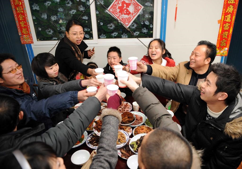2011年2月2日,浙江諸暨一家公司準(zhǔn)備了豐盛的年夜飯,招待800多名沒有回家過年的員工及其家屬,歡聚一堂共迎新年。