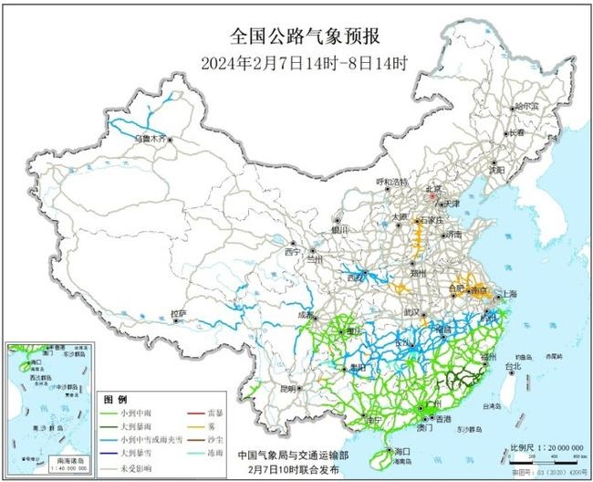 預(yù)計(jì)2月7日下午至8日下午,新疆西北部、青藏高原東部、川西高原北部和中部、貴州西部和東部、湖南北部和中部、江西北部、浙江北部等地部分地區(qū)有小到中雪或雨夾雪;貴州西部、湖南中部等局地有凍雨;江西東南部、福建南部等地部分地區(qū)有大雨。另外,河北南部、河南北部和西南部、江蘇西南部、安徽東部、湖北東南部等地部分道路受霧影響能見(jiàn)度低(見(jiàn)圖3,附件1)。