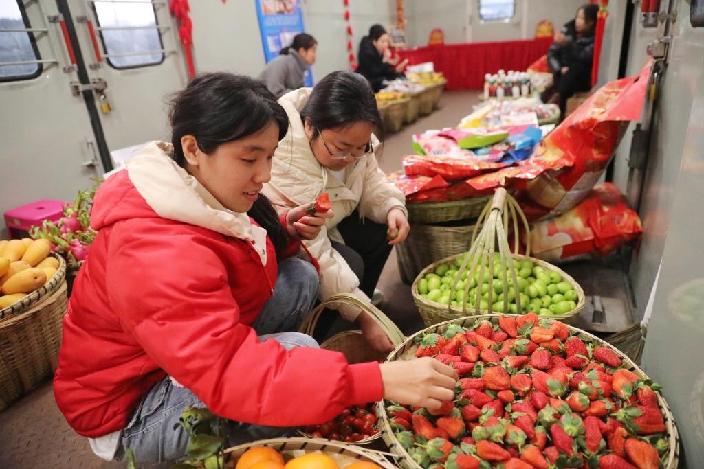 乘坐7466次列車的旅客在“慢火車”上的年貨街挑選草莓。(中國鐵路昆明局集團(tuán)有限公司供圖)