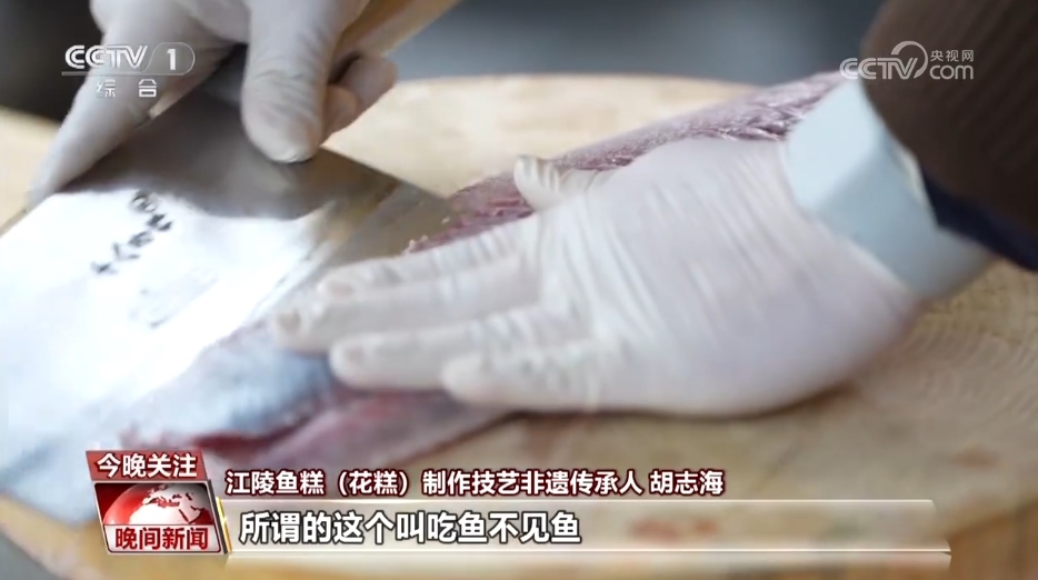 江陵魚糕(花糕)制作技藝非遺傳承人 胡志海:我們把這個魚紅全部要給它剔干凈,打出來的魚糕才會特別的潔白。剔干凈了之后,我們要把這個魚刺給它給剔掉。所謂的這個叫吃魚不見魚,也有魚糕香。
