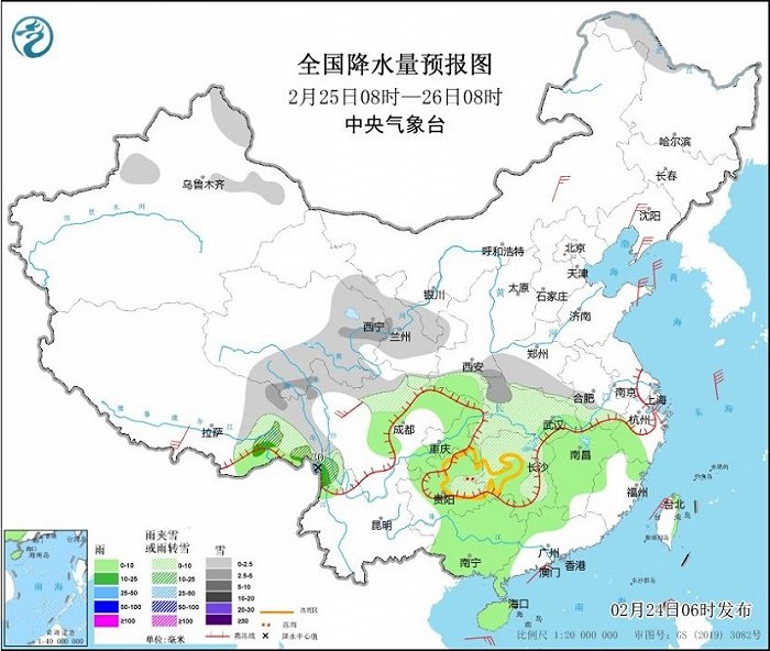 央視網(wǎng)消息:中央氣象臺(tái)網(wǎng)站2月24日消息,昨日,河南、安徽、四川等地部分地區(qū)出現(xiàn)了明顯的雨雪天氣,湖北、湖南及貴州部分地區(qū)出現(xiàn)凍雨。近期我國大部地區(qū)氣溫偏低,南方部分地區(qū)有雨雪冰凍天氣,公眾需持續(xù)做好防寒保暖,外出警惕雨雪冰凍天氣造成的路面濕滑,注意交通安全。