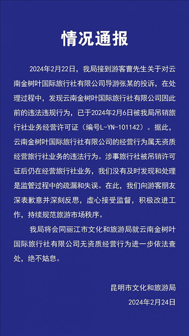 ·游客反映未買手鐲被導(dǎo)游趕下車,昆明文旅局通報(bào):涉事旅行社接團(tuán)前已被吊銷許可證。