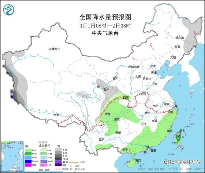 央視網(wǎng)消息:中央氣象臺網(wǎng)站2月29日消息,過去一天,全國雨雪逐漸發(fā)展增強,北方大部以降雪為主,集中在西北地區(qū)東部、內蒙古、山西、山東和東北三省等地;南方地區(qū)雨水范圍明顯擴大,江蘇、上海、浙江、安徽南部、江西中北部、湖南中南部、廣西北部等地部分地區(qū)出現(xiàn)中到大雨,今天凌晨起,蘇皖北部出現(xiàn)雨轉雪,江蘇連云港、宿遷、徐州等地雪花紛飛,并伴隨低溫和大風天氣,體感十分寒冷。