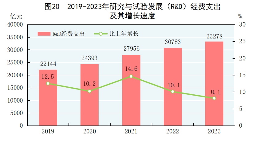 全年研究與試驗(yàn)發(fā)展(R&D)經(jīng)費(fèi)支出33278億元,比上年增長8.1%,與國內(nèi)生產(chǎn)總值之比為2.64%,其中基礎(chǔ)研究經(jīng)費(fèi)2212億元,比上年增長9.3%,占R&D經(jīng)費(fèi)支出比重為6.65%。國家自然科學(xué)基金共資助5.25萬個(gè)項(xiàng)目。截至年末,納入新序列管理的國家工程研究中心207個(gè),國家企業(yè)技術(shù)中心1798家。國家科技成果轉(zhuǎn)化引導(dǎo)基金累計(jì)設(shè)立36只子基金,資金總規(guī)模624億元。國家級科技企業(yè)孵化器[64]1606家,國家備案眾創(chuàng)空間[65]2376家。全年授予發(fā)明專利權(quán)92.1萬件,比上年增長15.3%。PCT專利申請受理量[66]7.4萬件。截至年末,有效發(fā)明專利499.1萬件,比上年末增長18.5%。每萬人口高價(jià)值發(fā)明專利擁有量[67]11.8件。全年商標(biāo)注冊438.3萬件,比上年下降29.0%。全年共簽訂技術(shù)合同95萬項(xiàng),技術(shù)合同成交金額61476億元,比上年增長28.6%。我國公民具備科學(xué)素質(zhì)[68]的比例達(dá)到14.14%。