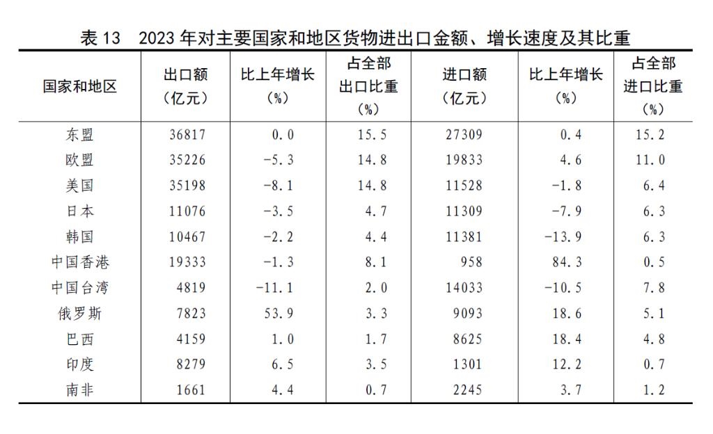 全年貨物進(jìn)出口總額417568億元,比上年增長0.2%。其中,出口237726億元,增長0.6%;進(jìn)口179842億元,下降0.3%。貨物進(jìn)出口順差57883億元,比上年增加1938億元。對共建“一帶一路”[46]國家進(jìn)出口額194719億元,比上年增長2.8%。其中,出口107314億元,增長6.9%;進(jìn)口87405億元,下降1.9%。對《區(qū)域全面經(jīng)濟(jì)伙伴關(guān)系協(xié)定》(RCEP)其他成員國[47]進(jìn)出口額125967億元,比上年下降1.6%。民營企業(yè)進(jìn)出口額223601億元,比上年增長6.3%,占進(jìn)出口總額比重為53.5%。