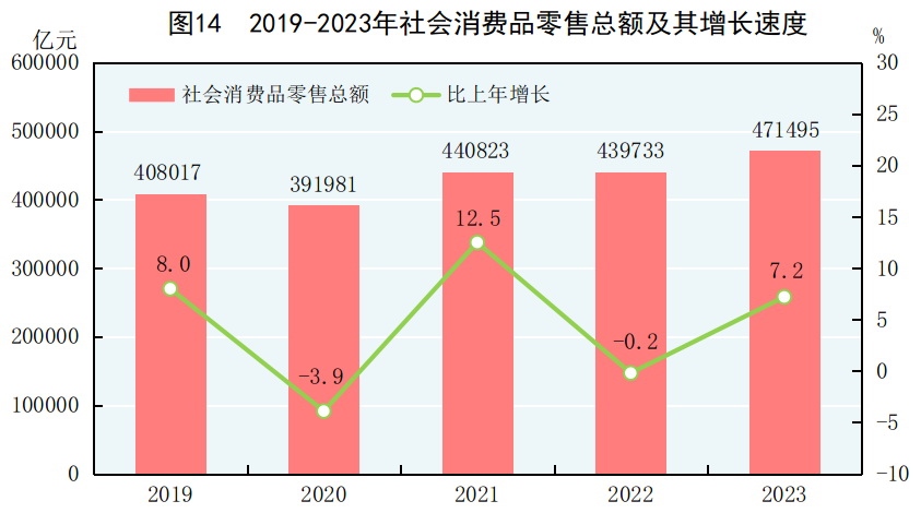 全年社會消費(fèi)品零售總額471495億元,比上年增長7.2%。按經(jīng)營地分,城鎮(zhèn)消費(fèi)品零售額407490億元,增長7.1%;鄉(xiāng)村消費(fèi)品零售額64005億元,增長8.0%。按消費(fèi)類型分,商品零售額418605億元,增長5.8%;餐飲收入52890億元,增長20.4%。服務(wù)零售額[36]比上年增長20.0%。