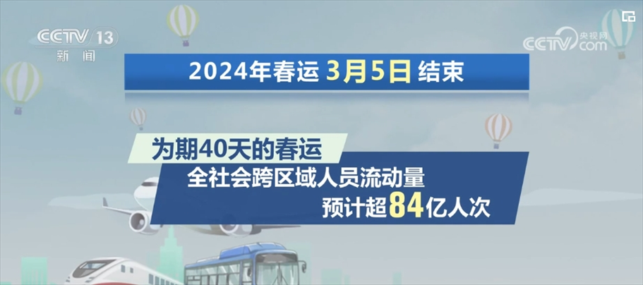 2024年春運3月5日結束,為期40天的春運全社會跨區(qū)域人員流動量預計超84億人次。其中,鐵路客運量預計完成4.8億人次;公路人員流動量預計完成78.3億人次,其中,高速公路及普通國省道非營業(yè)性小客車人員出行量預計完成67.2億人次,在全社會跨區(qū)域人員流動量中占比約80%,公路營業(yè)性客運量預計完成11.1億人次;水路客運量預計完成2900萬人次;民航客運量預計完成8300萬人次。