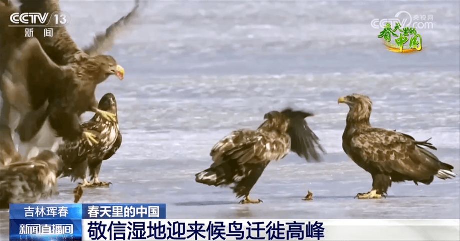 在琿春敬信濕地的龍山湖面上,數(shù)十只白尾海雕、虎頭海雕等珍稀候鳥(niǎo)嬉戲打鬧、爭(zhēng)搶食物,熱鬧不已。湖邊的攝影師們不時(shí)按動(dòng)快門(mén),捕捉鳥(niǎo)類(lèi)舞動(dòng)的精彩瞬間。