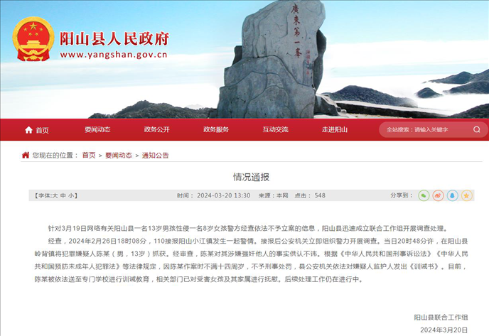 ·官方通報(bào)“13歲男孩性侵8歲女童警方不立案”:涉事男孩已被送至專門(mén)學(xué)校進(jìn)行訓(xùn)誡教育。