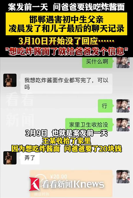 ·3月20日凌晨,邯鄲遇害初中生王某的父親發(fā)布了和兒子的聊天記錄。案發(fā)前一天,王某收拾了家里,因?yàn)橄氤哉ㄡu面,問(wèn)爸爸要了20塊錢(qián)。
