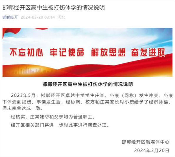 ·河北邯鄲一學(xué)生被同學(xué)打傷睪丸休學(xué),打人者自稱姥爺是縣長(zhǎng),當(dāng)?shù)赝▓?bào)。