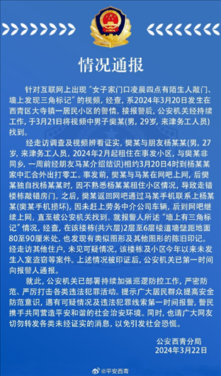 ·天津警方通報網(wǎng)傳“女子家門口發(fā)現(xiàn)三角標(biāo)記”。