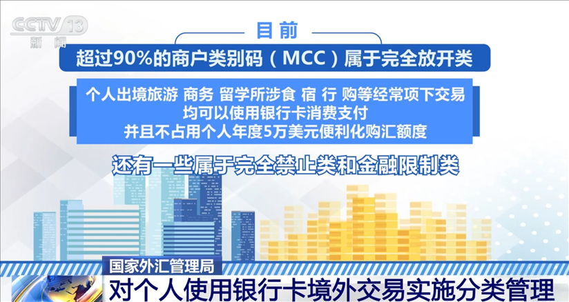 根據(jù)規(guī)定,目前,超過90%的商戶類別碼屬于完全放開類,個人出境旅游、商務(wù)、留學(xué)所涉食、宿、行、購等經(jīng)常項下交易,均可以使用銀行卡消費支付,并且不占用個人年度5萬美元便利化購匯額度。此外,還有一些屬于完全禁止類和金融限制類。