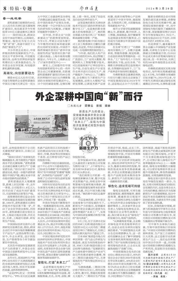 諾和諾德日前增資約40億元人民幣在天津打造無菌制劑擴(kuò)建項(xiàng)目、??松梨诮衲陮⑼顿Y100億元建設(shè)惠州乙烯項(xiàng)目……一段時(shí)間以來,跨國企業(yè)在中國動(dòng)作頻出,以高端化、智能化、綠色化為發(fā)力點(diǎn)向“新”求“質(zhì)”,競逐中國時(shí)下大熱的“新質(zhì)生產(chǎn)力”。
