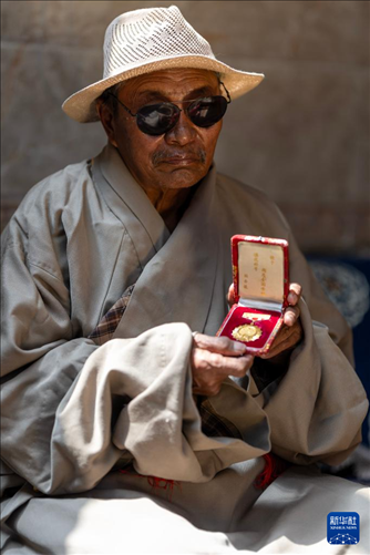 白瑪老人展示自己的全國勞動模范獎?wù)拢?月27日攝)。新華社記者 姜帆 攝
