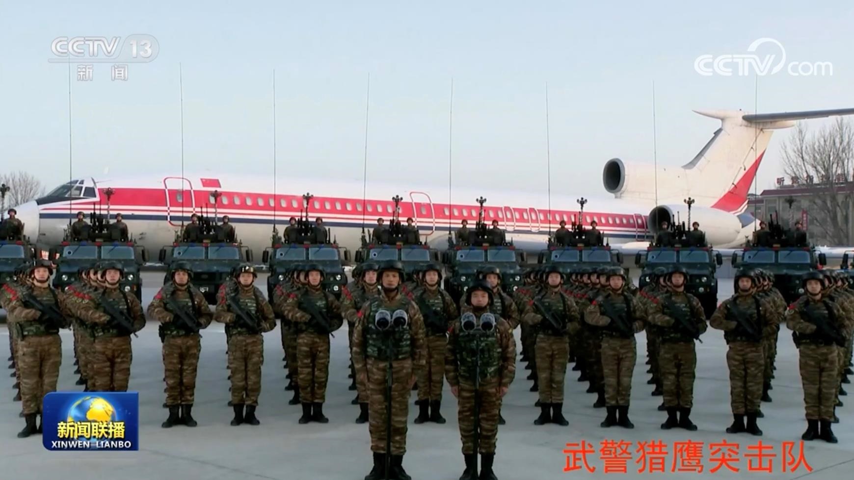 △2023年1月18日,習(xí)近平主席在北京八一大樓以視頻方式檢查部隊(duì)?wèi)?zhàn)備工作,親切慰問有關(guān)部隊(duì)。這是武警“獵鷹突擊隊(duì)”在進(jìn)行匯報(bào)。