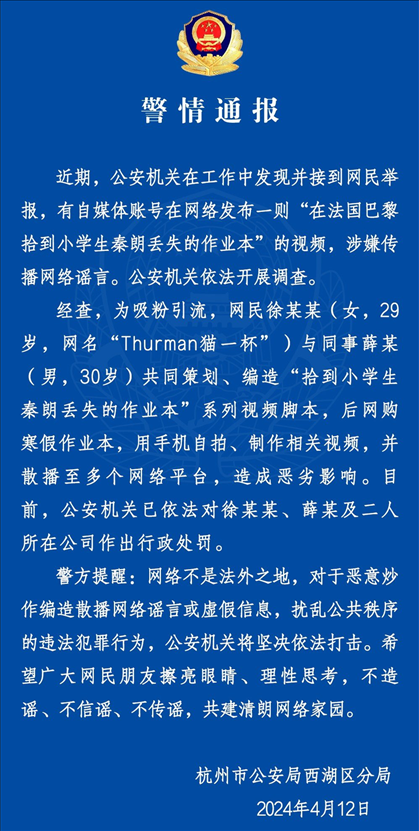·警方通報(bào):“秦朗巴黎丟作業(yè)”系編造,涉案公司被處罰。