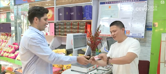 蔡恩還展示了一次現(xiàn)金購(gòu)物的過(guò)程。他在ATM機(jī)用外卡取現(xiàn)后,來(lái)到水果店挑了一些水果,價(jià)值88元人民幣,他支付一張百元整鈔,店主拿出前期銀行上門(mén)兌換的“零錢包”,順利找零12元。