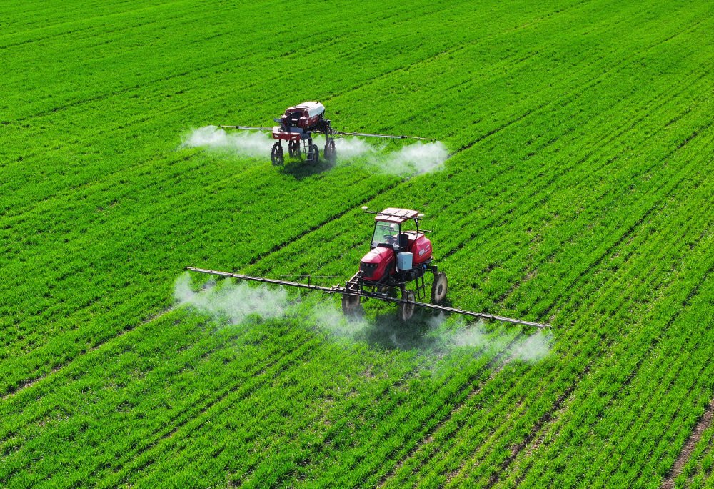 2024年3月13日,在安徽省蚌埠市五河縣頭鋪鎮(zhèn),農(nóng)民駕駛農(nóng)機(jī)給小麥噴灑農(nóng)藥。新華社記者 黃博涵 攝