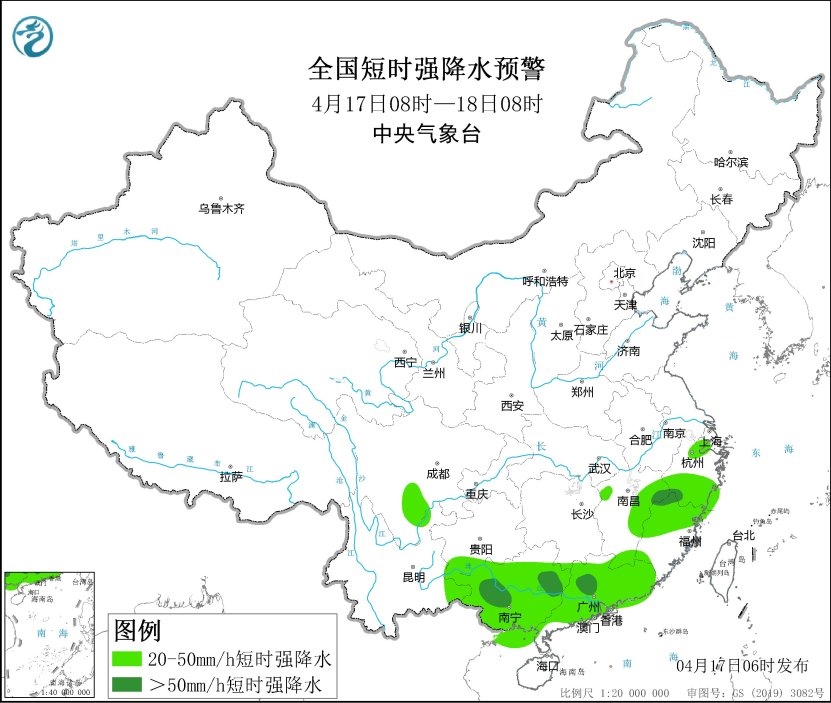 預(yù)計(jì)4月17日08時(shí)至18日08時(shí),江西東北部、浙江南部、福建北部、廣西東部和西南部、廣東中東部和西北部等地的部分地區(qū)將有8-10級(jí)雷暴大風(fēng)或冰雹天氣,局地風(fēng)力可達(dá)11級(jí)以上;江西中北部和南部、浙江、福建、四川南部、貴州西南部、云南東南部、廣西、廣東等地的部分地區(qū)將有短時(shí)強(qiáng)降水天氣,最大小時(shí)雨量30-60毫米,局地可達(dá)70毫米以上。