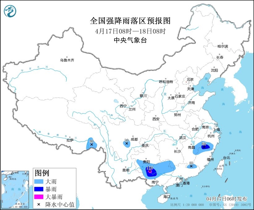 預(yù)計(jì),4月17日08時(shí)至18日08時(shí),江西中北部、浙江南部、福建西北部、四川盆地西南部、貴州東南部、廣西中北部、廣東北部等地部分地區(qū)有大到暴雨,其中,廣西西部等地局地有大暴雨(100~110毫米)。上述部分地區(qū)伴有短時(shí)強(qiáng)降水(最大小時(shí)降雨量30~60毫米,局地可超過(guò)70毫米),局地有雷暴大風(fēng)等強(qiáng)對(duì)流天氣。