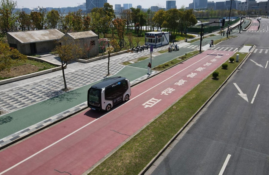 在中國(上海)自由貿(mào)易試驗(yàn)區(qū)臨港新片區(qū),一輛無人駕駛汽車行駛在自動(dòng)駕駛測(cè)試專用路上(無人機(jī)照片,2024年4月9日攝)。