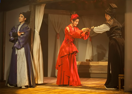 新國風(fēng)環(huán)境式越劇《新龍門客?!菲鸪踉诙桃曨l平臺(tái)走紅,熱度從線上傳導(dǎo)至線下,許多從未接觸過越劇的觀眾走入劇場。環(huán)境式劇場不同于傳統(tǒng)劇場的鏡框式舞臺(tái),舞臺(tái)不只是面前的一塊區(qū)域,而是實(shí)現(xiàn)了觀眾“身在其中”,濃厚的“氛圍感”撲面而來。