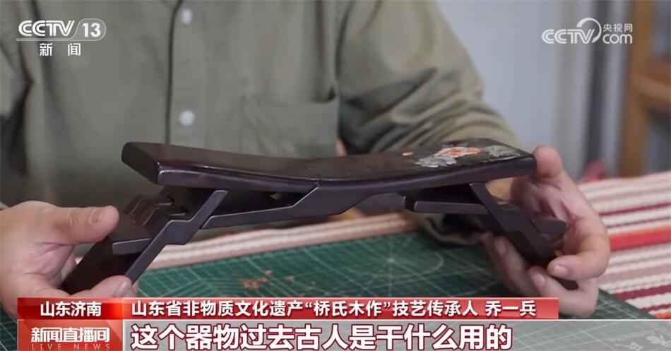山東省非物質(zhì)文化遺產(chǎn)“橋氏木作”技藝傳承人喬一兵介紹:“它本身是一整塊木頭六個(gè)面,通過(guò)鋸和鑿形成一個(gè)器物。這個(gè)器物過(guò)去古人是干什么用的?當(dāng)枕頭用的,也可以當(dāng)?shù)首佑茫畲蟮奶攸c(diǎn)是可以折疊,攜帶非常方便,傳說(shuō)是魯班發(fā)明的。和眾多的優(yōu)秀的傳統(tǒng)技藝一樣,它深層次代表的是中國(guó)的一些思想、一些哲學(xué)、一些文化在里邊,魯班枕的核心是平衡和和諧,我覺(jué)得我很有必要把它傳承下來(lái),發(fā)揚(yáng)光大?!?/p>