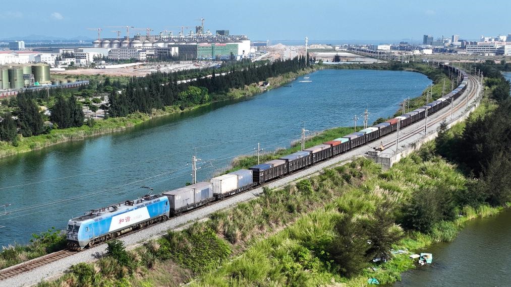 圖為一趟滿載貨物的西部陸海新通道鐵海聯(lián)運(yùn)班列從欽州港東站駛出(無人機(jī)照片)。新華社記者 張愛林 攝