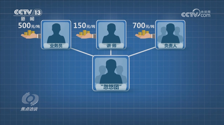 氯化銨和硫酸銨都屬于氮肥的生產(chǎn)原料,成本價約為800—900元/噸。據(jù)專案組調(diào)查,幾個代工廠將原料簡單攪拌裝袋后,賣給定制化肥的總經(jīng)銷商張某華,價格就變成1100—1200元/噸,中間差價約300元/噸;總經(jīng)銷商張某華把化肥交付給代理商張某昌,價格為1375元/噸,差價約200元/噸;張某昌轉(zhuǎn)賣給實體“忽悠團”的價格為1900元/噸,中間差價約500元/噸;“忽悠團”賣給農(nóng)戶的最終價格為3250元/噸,其中:業(yè)務(wù)員每噸抽成500元,講師每噸抽成150元,“忽悠團”幾位負責人每噸獲利700元。就這樣,每噸成本不到1000元的氮肥,披著復(fù)合肥的外衣,在農(nóng)戶手里翻了三倍多。