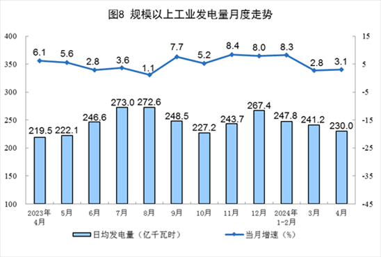 分品種看,4月份,規(guī)上工業(yè)火電、水電、太陽能發(fā)電增速加快,核電由降轉增,風電同比下降。其中,規(guī)上工業(yè)火電同比增長1.3%,增速比3月份加快0.8個百分點;規(guī)上工業(yè)水電增長21.0%,增速比3月份加快17.9個百分點;規(guī)上工業(yè)核電增長5.9%,3月份為下降4.8%;規(guī)上工業(yè)風電下降8.4%,3月份為增長16.8%;規(guī)上工業(yè)太陽能發(fā)電增長21.4%,增速比3月份加快5.6個百分點。