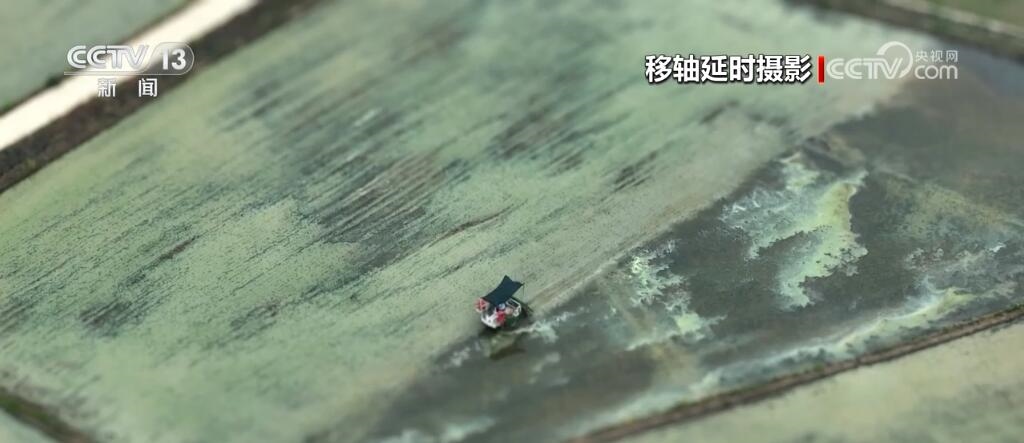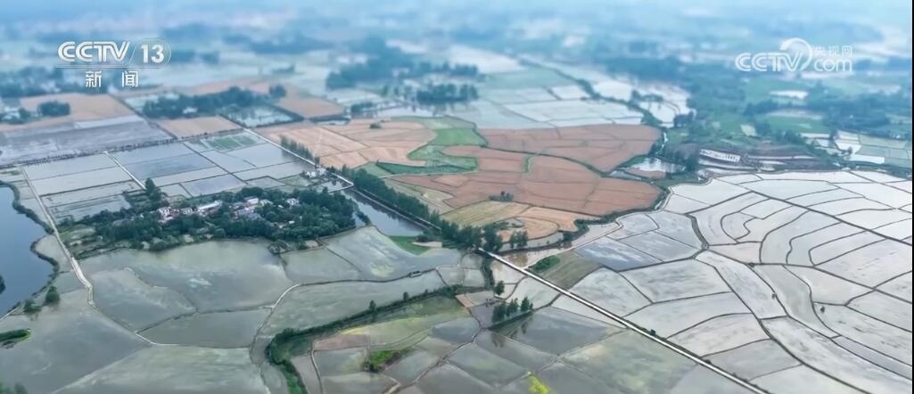 現(xiàn)在您看到的是河南信陽淮河以南的水稻插秧現(xiàn)場。插秧機在田間穿梭,一株株茁壯的秧苗被整齊有序地植入田間,一會兒工夫就插滿了整塊稻田??罩懈╊?,一臺臺插秧機在農機手的操控下好似一把把畫刷,在稻田上輕輕暈染,繪就丹青。而同在信陽,淮河以北的麥田里,則是金色的麥浪翻滾起伏,收割機馳騁田間,飽滿的麥穗被卷入機艙,經過收割、脫粒,顆粒歸倉。