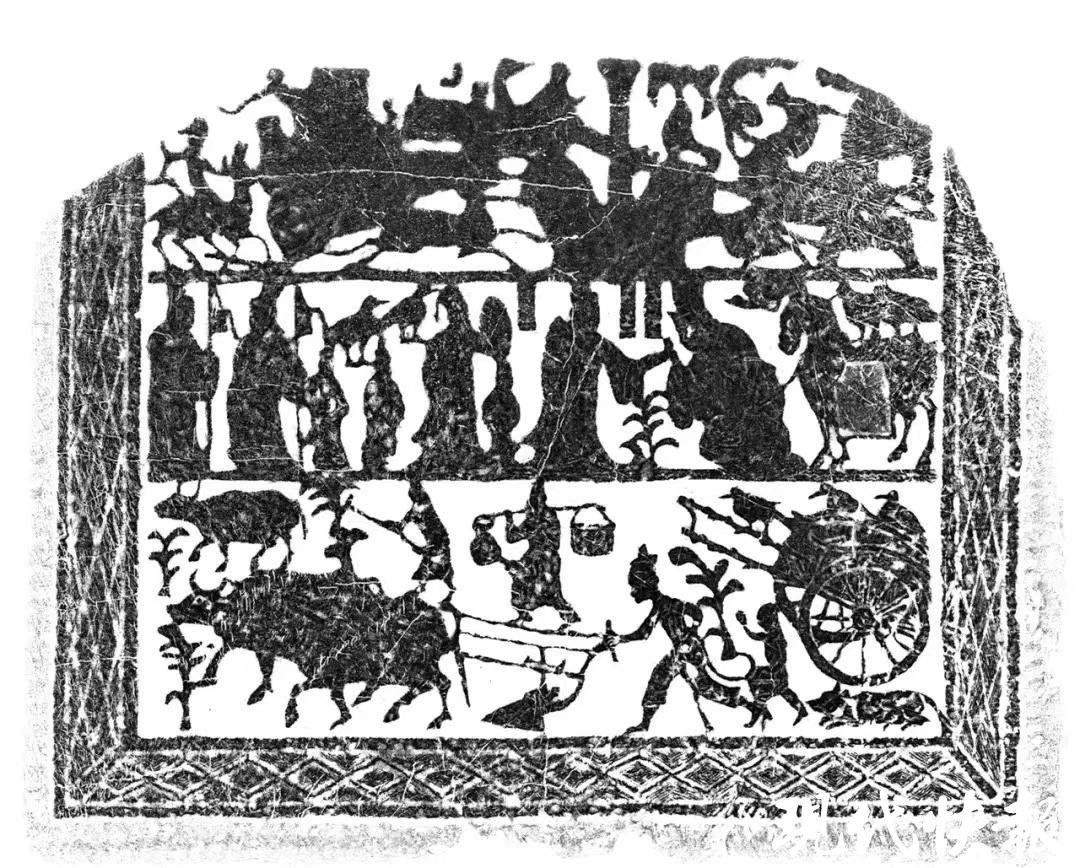 江蘇徐州出土的《牛耕圖》漢畫像石顯示,一個農(nóng)民扶犁犁地,犁由二牛牽拉。一人揚手撒種子跟在扶犁后面。他的后面停著一輛車,車旁臥著一只狗。旁邊有一個趕牛者,后面有一人挑著擔(dān)子,像是送食物的。