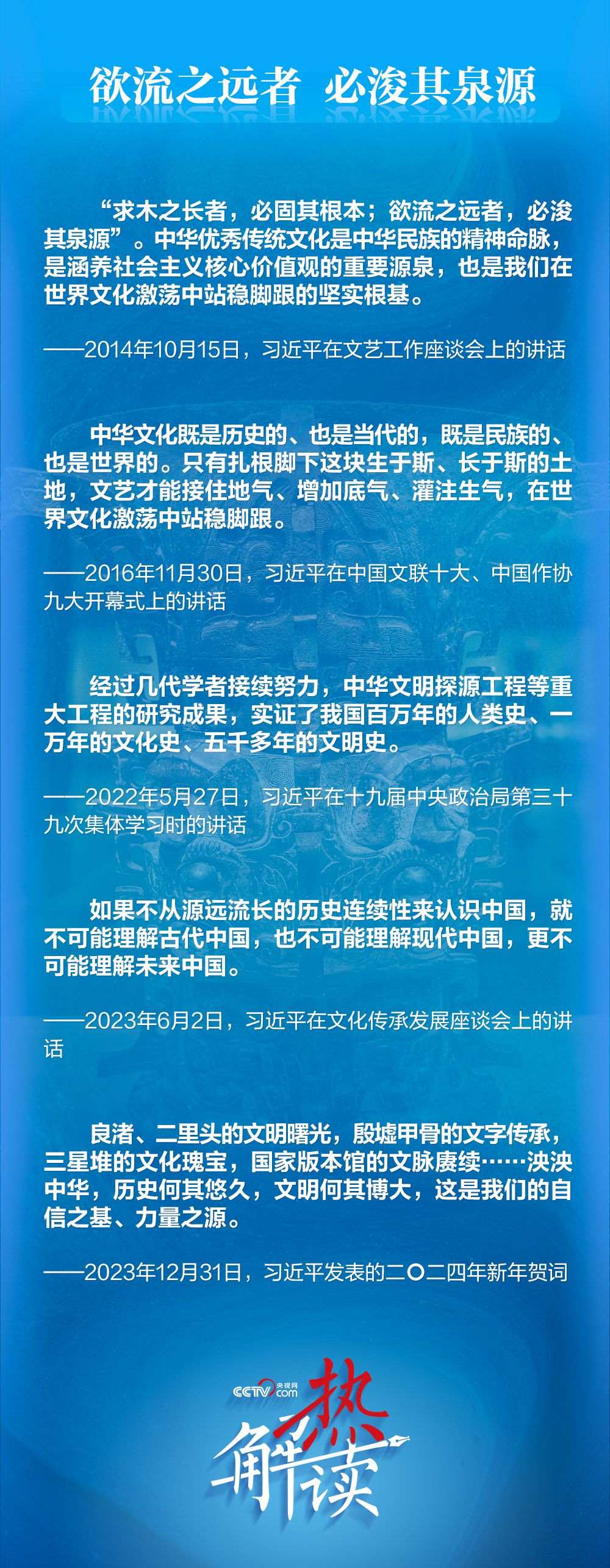 一件件文物、一處處文化古跡、一項項文化藝術,串連起中華民族的文化史,蘊藏著“何以中國”的文化力量。總書記對中華文明之源的關注,彰顯的正是他對推動文化繁榮、建設文化強國的深刻思考和文化自信。