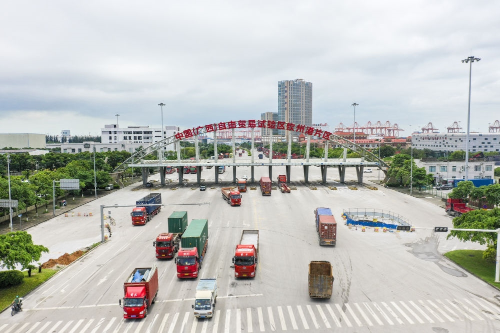 中國(廣西)自由貿(mào)易試驗區(qū)欽州港片區(qū)(2024年5月20日攝,無人機(jī)照片)。聚焦面向東盟、服務(wù)陸海新通道、沿邊開放三大特色,開展差異化探索和特色制度創(chuàng)新,讓中國(廣西)自由貿(mào)易試驗區(qū)成為我國面向東盟開放發(fā)展的前沿。