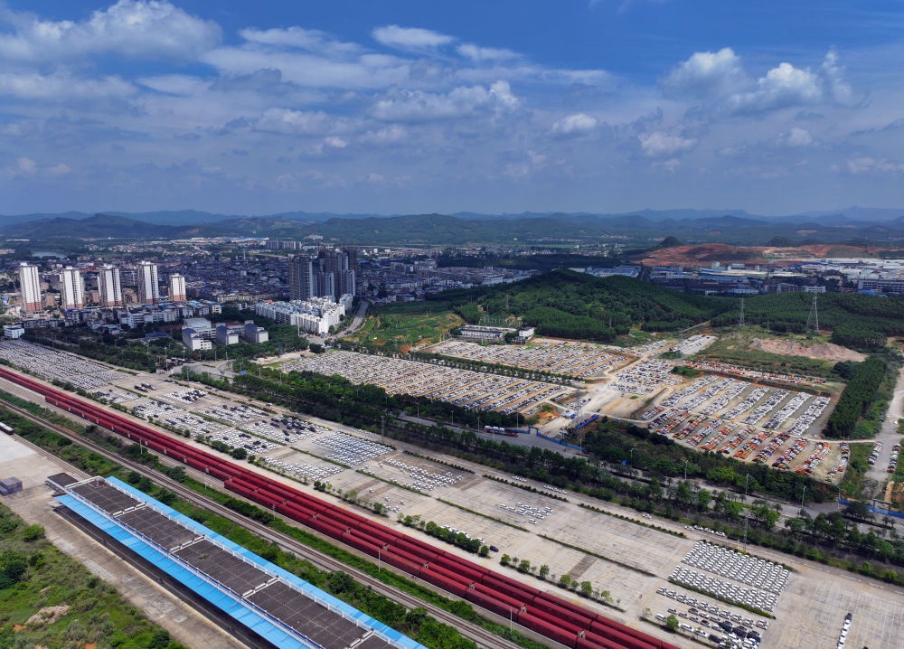 汽車在廣西柳州雒容汽車物流基地等待進(jìn)入鐵路貨車車廂。部分出口的新能源汽車從這里裝車運往各大出海港口(2024年5月24日攝,無人機(jī)照片)。
