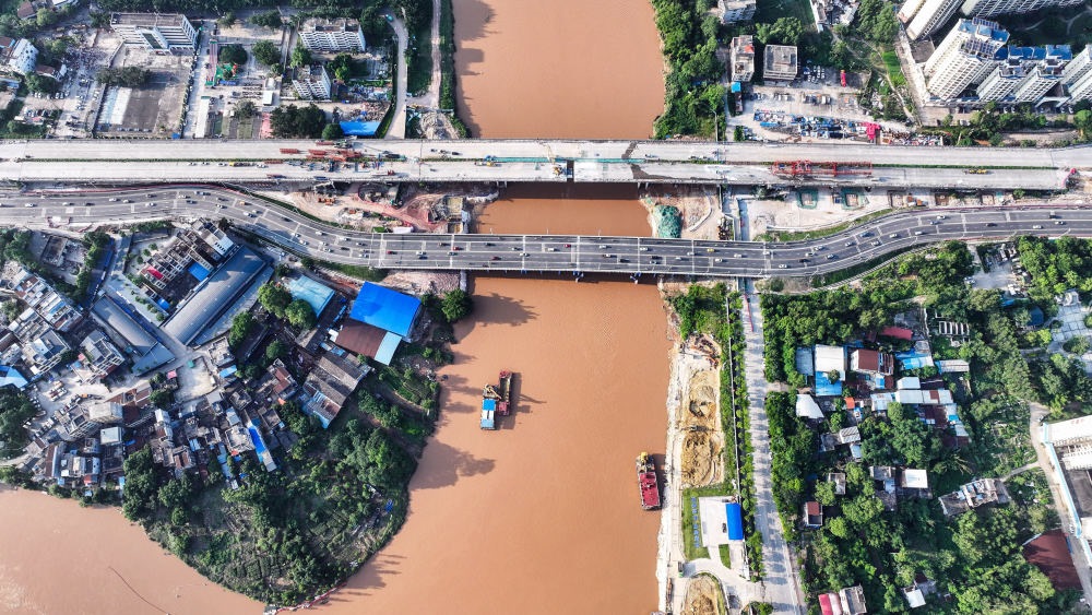 施工隊在廣西欽州市拆舊橋建新橋,疏浚平陸運河流經(jīng)欽州市區(qū)的航道(2024年5月12日攝,無人機(jī)照片)。平陸運河建成后將成為廣西及西南地區(qū)通往東盟地區(qū)運距最短、最便捷的水運出海通道。